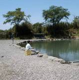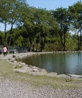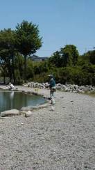 ゴールデンウィークも終わり、きっと、どこの釣り場も「GW特別サービス放流」の魚がたくさんいるはず・・・と勝手に決め付け、 今週も釣行を計画。まだ行ったことがない管理釣り場も多いので、その中から「日の出つり掘」を選択しました。 「日の出つり掘」は「アングラーズ プラッツ」のすぐ近く、隣と言っても過言ではない場所にあります。 ●↓の写真 正面「プラッツ」の釣り場 左からの道では、「プラッツ」前でヘアピンターンし、釣り場の下を回りこみ、すぐ右の竹林が「日の出つり掘」 ![]() ![]() ![]() ●ヘアピンの所にあるカンバン ●入り口カンバン ●ホントは「日の出水産」?? ![]() 関越道高崎IC経由、午前8時30分、「日の出つり掘」駐車場(15台くらい?)に到着。 駐車場は、日の出つり掘の経営者の自宅前、庭という感じで、竹林と大きな木に囲まれて、涼しそうです。 ●駐車場から釣り場への道。右に管理棟がある。(左に犬がいますが、おとなしいです。) ![]() 管理棟やその他の施設もちょっと古いですが、釣りが目的の釣り人にはあまり関係ありません。 「さあ、ここは釣れるかな?」と期待と不安を同時に抱いて、釣り券購入のため、管理棟に入りました。 プラッツと同じく、時間釣りができるシステムのようなので、とりあえず3時間(\2000)にしました。 料金システムは、最初の1時間が\1000、後は1時間毎に\500のようですが、1日(8時間)は\5000。 半日券(\3000?)もあるみたいです。 「池の深さはどのくらいですか?」と聞くと、ここの奥さんらしい人が 「あんまり深くないんですが、一番深い所で、2.8m、南側が深いです。」とのこと。 それじゃ、南側から釣ってみようと思い、池の南側へ。釣り場は30m×100mの、陸上競技のトラック型池一面。 ●↓池から前橋市街が見下ろせます。 のどかな景色です。 ![]() ![]() ![]() ![]() ![]() ●釣り位置=南側中央から(カメラを振って手動パノラマ撮影=かなり広角に歪んでます) 中央=管理棟 岸から島へ、パイプが渡っています。 連休の次の週のためか、いつもそうなのか、あまりお客さん(釣り人)は多くありません。 さっき通り過ぎてきた「プラッツ」の方が多いみたいでした。10人くらい。ルアーとフライ半々。フライは全員ルースニング。 池は濁りがあります。 足元の水中にロッドを突き刺すと、1m弱。偵察用にシンキングのタイプⅡを選択。 釣り開始・・・コンスタントに当たります。カウントダウン(15秒程度)するので、3投に1尾のペース しかし、どうも池の中の様子が掴めません。池の下層に流れがあるみたいです。 水中で、(島を中心に)時計回り方向にラインが流されている感じがします。流れ込み、流れ出しの関係でしょうか? それでも、まあ快調なペースで釣れるので、あまり気にせず、釣り続けました。 10時頃、池より一段高い所にある生簀から、パイプを通して放流。おもしろい方法です。 池の水中に突き出したパイプから魚がバシャバシャ出てきます。(笑) なお、放流したのは、ここの娘さんらしいお嬢さんでした。 今日はいい天気で、暑いくらいでした。(肌が弱い私は日焼け止め使用、ちなみに、いつも長袖着用) 当たりは止まることなく、そのままの調子で、3時間経過。お昼少し前、ここまで27尾。 迷わず、時間延長することに。夕方まで釣るなら、いろいろ延長の方法はあるみたいですが、 今日は早めに4時ごろ帰ろうと思ったので、4時間追加(\500×4=\2000) 延長もしたので、「まあ、のんびりいこう」と、車に戻り、ランチ。 (私が車で食事していたら、弁当屋の車が配達にきましたので、釣り場の食事は弁当注文かも知れません) 駐車場の木陰は気持ちよく、イスを出して、ドリンクを飲みながら、しばし休憩。犬といっしょにウトウト・・・。 ←単独釣行では、こうゆう写真になります。(^.^)池の周りにも、日陰のできる大きな木があり、夏場は助かるだろうなと思いました。 すっかり、リフレッシュして午後の釣り開始。 午後はルースングにしようかなとも思いましたが、あまり当たっている人がいなかったので、そのままシンキングで釣り続行。 釣り人は、午前で帰る人も数人いて、さらに少なくなりましたので、シンキングで広角にキャストしてもOK。 当然、午前ほどではないですが、まあまあ当たります。(午後も放流がありました。) 釣り位置も、あちこち移動してみました。ポイントは島の東側がいいようですが、流れの関係で底の状況が読みきれないので、 イマイチ確信がありません。 ●↓本日最大は36cmでした。 ![]() ちなみに、私の釣果では、イワナ1尾以外はすべてニジマスでした。F1など変り種の魚種は入れてないみたいです。 午後(1時〜3時40分)、14尾。合計41尾。充分楽しめました。 よく当たったのは、定番マラブーオリーブ。リトリーブはスロー&ストップ。キャスト直後のフォールで当たることが多かったです。 帰り際、釣り場のおやじさん(?)に声をかけられ、 「釣れましたか?沼田の方に雨が降って、雪代が入ったような状態に