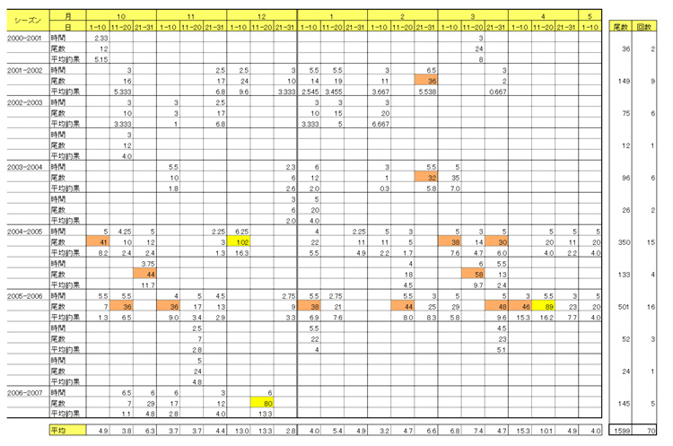 先週の釣行(2006/12/16 釣果80尾)で、そう言えば、最高記録(2004-12-04 102尾)も12月だったな と思い、 2000年10月から現在(2006年12)までの釣行データを分析してみました。(^_^) ![]() 総釣行回数=70回、総釣果=1599尾。 爆釣(30尾以上)回数=16回 その内、ダブル爆釣(60尾以上)=3回。最高尾数=102尾。 注目は、月・旬別の「1時間当たりの平均釣果」(もちろん、私の釣行データ)。 ・・・つまり、「いつ頃が一番釣れるのか?」という点ですね。 ![]() ・・・こんな結果になりました。う〜ん、傾向があるような、ないような(^_^;) とりあえず、12月前半と4月上旬はいいみたいです。 |