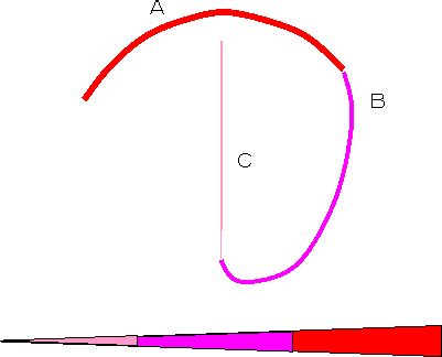 このラインはエアフロ社HPに情報がありません。例2 : VISION社 Ace Single VAS6F 9,6m 15g 例3 : Rio社 AFS head 4/5F 9,5m 19g 例4 : GUIDE社 POWER TAPER DUALE FLOAT SINGLEHAND #5/6 11.5m 14g ![]() 「いつものシングルハンドロッドでラインシステムを替えるだけで・・・・」ということは、 逆に言えばラインシステム(シューティングヘッド)といつものシングルハンドロッドのバランスが重要になります。 キャスティングテクニックよりも重要かも知れません。 さて、重心についてはキャスティングにおいても注目する必要があります。例えば、 ■ヘッドの折りたたみの時は・・・ ![]() 上の図ではヘッドを同じ太さで書いていますが、極端にデフォルメして、例えば3つの部分に分けると ![]() こんな感じになると思います。 A:B:Cの重量のバランスが3:2:1とし、このヘッドを水面から引き上げるのに必要な力を全部で6とした場合、 またはこのヘッドを水面から引き上げるのに必要なティップの移動距離(ストローク)を全部で6とした場合、 どのような力加減、どのようなロッドの動かし方をすればいいのか? ・・・というように、重心や重量的なバランスも考えてキャストするといいと思います(^_^;) |