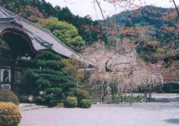 写真は、宸殿前の樹齢150年といわれるしだれ桜。もみじなどの紅葉も美しい。