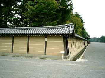 周囲には5筋の白線を引いたうす茶色の築地塀が巡らされています。