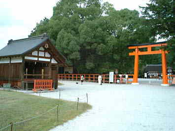 左が神馬小屋。正月や行事のある時は白馬の神馬がいます。