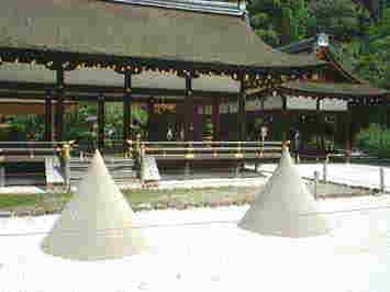 細殿前には、松葉を差した2つの円錐形の「立て砂」が並ぶ。
