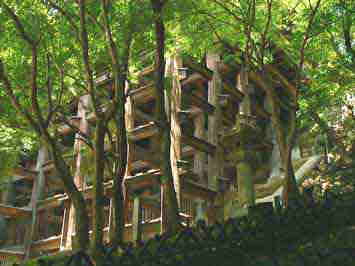 崖地に多数の支柱を建てて舞台を支える手法は懸造と呼ばれ、「清水の舞台」は釘を使わずに139本の柱を組み合わせて支えています。