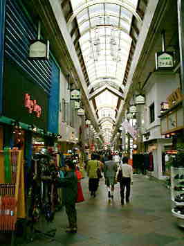 観光客や修学旅行生で賑わう狭い通りには、みやげ物店、映画館、飲食店が並んでいます。