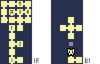 ■スタート上でちいさなカギを入手後、通路の右側を進み、1の突き当たりから地下に降りる