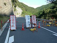 ◆左の画像を見て頂きたい。これは平成13年10月19日の午後、R424有田郡金屋町修理川付近で私が遭遇した全面通行止めである。◆この時、私が車を停めてこの写真を撮ったり、迂回路を探索したりしている間に、観光者と思しき車が3台ほどやってきて、そのいずれもが恨めしげにこのバリケードを見て途方に暮れていた。私の場合は単に「道の駅・しらまの里」へ「ビン入り梅茶漬けの素」を買いに行くだけだったのだが、私に話し掛けてきた老夫婦は龍神温泉まで行く途中だったそうだ。協議の結果「迂回路無し」との判断を下し、老夫婦は吉備町方面へ去っていった。 ◆工事の為に、国道が全面通行止めになった上、迂回路も無いなんて事は都市圏に住んでおられる方には想像もつかない事だろう。事故等で、一時通行止めになるのがせいぜいではないだろうか。 ◆だが、一車線区間の多い3ケタ国道ともなると、そうはいかない事が非常に多く、工事ともなると全面通行止めになることなど「何の不思議も無いこと」だ。上のケースでは、通行止めが判明するのが通行止めされている場所からたった数キロ手前だったため、かなりの距離を戻らねばならず混乱を招いている。要所にはきちんと分かりやすく、情報を提示しておいて欲しいものだ。◆ちなみに右の画像のトンネルは、上の通行止め地点から少し手前を右に川を渡ったところにあった工事中のトンネルである。「寒川トンネル」と書かれている。その後も一ヶ月の間に二度訪れたが、工事はあまり進行していないようだった。上の通行止めが解除されてから通行すると、ここから3キロほど南下したあたりの山間に鉄橋のようなものの建設工事が行われていた。丁度駐車スペースがあったので駐車し、警備員のおじさんに「あれは何の橋ですか」と尋ねたが、おじさんは「別に・・・ただの橋よ・・・何でもないで」などとよく判らないウヤムヤなコメントを残してくれた。説明ぐらい、できないもんなのか?実際には、修理川〜宇井苔間のクネクネ準酷道区間をバイパス化する工事であり、この記事を書いた7年後の現在も工事は進行中である。っつかまだまだかかりそう。 |