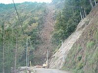 ●●●土砂崩れ 山肌を縦に走るハゲ部分。決して木を伐採しているわけではない。そう、土砂崩れだ。崩れた部分の下にある黄色いものはユンボ。その左の茶色の固まりは樹木と落石の塊。あっと無論、あれだけで済んではいない。画像には写っていないが、さらに左には木や石が沢山集められていた。さらに、画像の左下が川になっているのだが、ナダレ落ちたと思われる樹木が多数・・・ナンマンダブ。 |