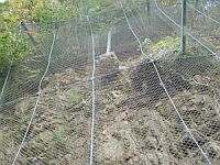 ●●●ネットと支柱の、持ちつ持たれつ 注意して、よ〜くご覧あれ。何らかの違和感を覚えるはず。ハイその通り、支柱が落石防止ネットを支えなければいけないはずなのに、支柱がネットに「支えられている」わけだ。土砂崩れで支柱を支えていた基部が崩れて首の皮一枚残ったような状態。とりあえず、ネットを張っていたお蔭で支柱が落ちずに済んで・・・ん?本末転倒って、どんな意味だったかな? |