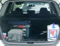 | 上は春頃・車中泊のみ2名・3泊時の装備一式 左から車載冷蔵庫(バッテリ付) RVボックス(ミニポンプ、電灯類、虫除け、タオル等が詰まってる) その上にエアマット、右はウォータージャグ 一応バンドやゴムロープ等で固定しとかないとワインディングで吹っ飛びます ちなみに布団類は薄手の折り畳みマット及び 毛布が2枚とお昼寝枕(二列目に置いてる) あとは衣類ぐらいのものです 必須アイテムや便利グッズはついつい集めたくなるもの でもそればかりでなく 不用な車載アイテムを発見し家に置いてくることも 快適なスペース確保のために重要なスキルです |