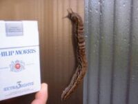 朝からこのような生き物に遭遇したくなかったのですが、見逃すにはあまりにも大きく、とっさにデジカメに収めました。さっちゃんもきっとこの手のネタは好きだろうと思い送ったのですが、皆様にはこの巨大生物の正体をあばいていただいて感謝です。結構見た経験がある方もいらっしゃるようで・・・。おもしろにはいつもながら絶句です。本物を目の前にしておもしろ談義なんかするともっとおもしろいかも。iammyさんには特別に拡大写真をさっちゃんにことづけましょうか?それかまた現れたら実物をことづけます。くろぅ。 |