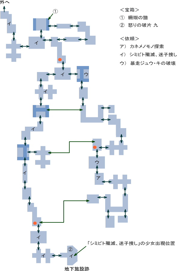 イ: シミビト出現位置。全て倒さないと迷子の少女が出現しません。 戻る