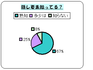 >もちろん、当サイト内に限った結果ですから過信は禁物です。 それでも、全く知らない方が8%しかいないのには驚きでしょう?さらに2つ見てみましょうか。