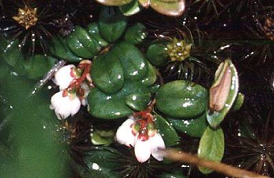 一見、草のようですが立派な木です。苔の生えている湿地帯で、苔のように小さいにもかかわらず、秋には丸くて甘酸っぱい真っ赤な実をつける事から、苔桃(こけもも)の名がついています。 釣鐘潟の淡い紅色の花がまとまってつく様子は、本当に可愛いとしか言いようがありません。写真はかなり拡大されておりまして、実物は花のひとつひとつが米粒かアズキ粒のような小ささでした。