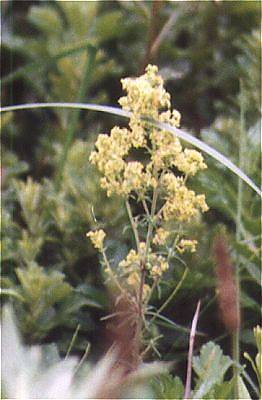白っぽい花もあって、そちらの方はチョウセンカワラマツバと呼ばれているようです。豊富(とよとみ)の海岸近くの道路沿いに、黄色い花と白い花が混ざって咲いていました。