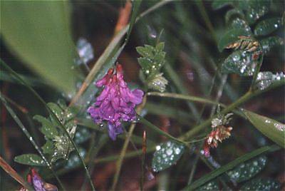 写真の花は、幌延(ほろのべ)の農道沿いで撮りました。まだ季節が早かったようで、株はたくさん見つけましたが、歩いた範囲で咲いていたのはこれひとつきりでした。それにしても、その辺を歩けばクサフジにぶつかるという自然の豊かさは、本当にうらやましいほどでした。雨さえ降っていなければ、もっと散策してみたかったです。