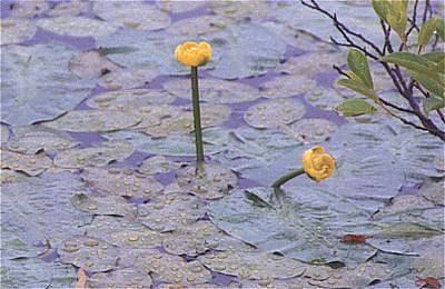根室河骨(ねむろこうほね)は、はじめ北海道の根室から知られたことによってこの名がつきました。オゼコウホネと同様に、葉は水面に浮かぶだけで空中に突き出すことはありません。オゼコウホネの雄しべの先(柱頭盤)が暗紅色であるのにたいして、ネムロコウホネは淡黄色であるところから区別がつきます。