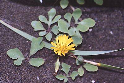 浜苦菜(はまにがな)は海岸に多く見られるニガナの意味です。茎は砂の中を這って伸び、葉だけを砂の上に出します。砂をかぶっても、すぐに新しい葉が地上に出てくるそうです。花期は春から夏までと長く、砂の中から花茎を伸ばして直径3cmくらいの黄色い花を数個つけます。