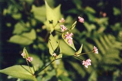 葉の形がソバの葉に似ていて、溝(みぞ)のような湿ったところを好むのことから。「ミゾソバ」の名がつけられました。1年草ですが、一株あれば、次の年にはあっという間に群落になります。