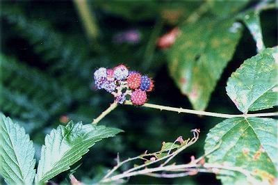 黒苺(くろいちご)は、夏に小さな淡紅色の花をつけますが、ほとんど目立ちません。その代わりなのか、秋になると黒い実が付くのでよく目立ちます。実は1cmくらいの球形で、未熟なうちは赤い色ですが、熟すと黒紫色になります。甘酸っぱくて美味しいのですが、知らないで見ると毒イチゴかと思われそうな色ではあります。写真のクロイチゴは熟しはじめで、もう3〜4日たつと食べ頃になりそうです。 野幌には木苺が4種類くらい生えていますが、クロイチゴはその中でも珍しいというか、めったに見つけられない木だったりします。