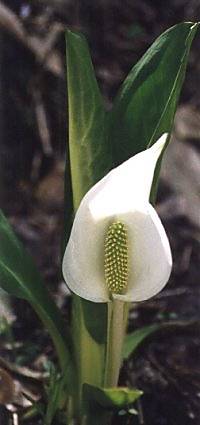 春の花といったとき、はずせないもののひとつがミズバショウのようです。花びらのように見える白い部分は葉の変形で苞(ほう)といいます。葉は、花が終わった後で1m前後に大きく伸びます。 誤解の無いような最初に行っておきますが、北海道ではミズバショウは高山植物ではありません。湿地にならどこでも生える比較的ポピュラーな花です。最近でこそ、自然公園のように昔の環境が比較的保護されたところでしか見られなくなりましたが、一昔前までは田んぼのアゼなどでも普通に見られたといいます。 群れて咲いている様子を見ると、白と黄緑のコントラストがなかなか綺麗です。1本の花をじっくり見ることは少ないのですが、写真はあえてアップで取ってみました。綺麗という花では無いですが、なんとなく清楚でありながら強い感じを受けるのは、花びらに見える苞のせいかもしれません。印象が強いような弱いような、よくわからない花でもあります。 それにしても、直径2メートル前後に育ってしまった夏の株の様子を見るに付け、異称の「ヘビノマクラ」がぴったりの植物だなあ、と思わざるを得ません。ちなみに、5年前の夏、この葉っぱの上でとぐろを巻いた蛇を見てしまったことがあります。私もかなりビックリしましたが、蛇の方もこちらを見つけると、ビックリしてそそくさと逃げて行きました。
