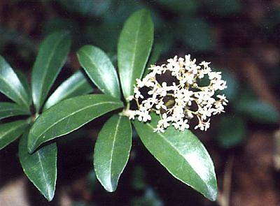葉の感じが仏前に供えるモクレン科の樒(しきみ)に似ていて、枝が低く地面を這って伸びることから蔓樒(つるしきみ)の名がつきました。花の直径は5〜6mmで、枝先に球形につきます。花弁は4枚。