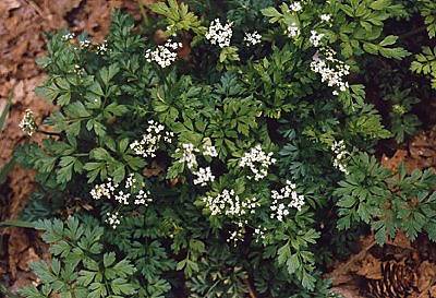 セントウソウの名の由来は不明のようですが、別名のオウレンダマシは、その葉の形がキンポウゲ科のオウレンという植物にどことなく似ているところからついた名です。花茎は細く、先に3〜5個くらいの直径2〜3mmの小さな白い花をつけます。