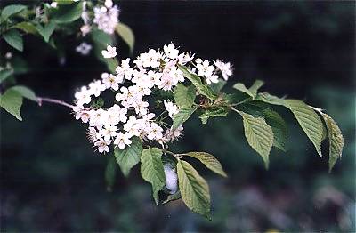 小豆梨(あずきなし)の名は、秋になると1cm程度の楕円形気味のアズキのような赤い小果実が生るところから来ています。春の終わりからわき始める花は、白い花びらが5枚で、写真のように数花が集まってつきます。ナナカマドの仲間ということですが、葉や花を見ただけではサクラの花かと錯覚するほどですが、森林公園では、毎年、サクラが終わると同時に咲き出します。秋になって赤い実が鈴なりになったのを見て、やっとナナカマドの親戚なんだなあと納得されます。 写真のアズキナシは、森林公園の札幌側の散策道の入口にありました。ミツバチやクマンバチが蜜を集めに頻繁にやってくるので、刺激をしないようにと、ひやひやしながら撮った1枚です。