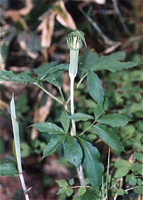 茎に紫褐色の斑点があることから、毒ヘビの「マムシ」に見立てたマムシグサの名の方が通りがいいようですが、正式名称はコウライテンナンショウ(高麗天南星)と言うようです。今でこそ春の花として見慣れた存在になりましたが、はじめて見た時は薄暗いところにポッカリと咲いた緑色の花が、なんとも不気味に感じられたものです。根茎には毒がありますが、江戸時代など飢餓の際には晒して食料としたと言います。漢方でも薬として用いるようで、見かけによらず(?)色々役に立つ植物のようです。 雌雄異株ですが、同じ株が栄養が足りているときは雌に、足りないときには雄になる性質があります。秋には真っ赤な果実がたくさん付くと、花とは違ってとても目立つ存在になります。
