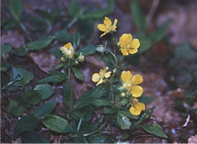 散策路を飾っていたニリンソウも終わりかけて、道ばたの花が淋しくなって来たと感じる頃に、所々で目に飛び込んで鮮やかな黄色がキジムシロです。思わず足を止めて、長々と見入ってしまうことも多いです。