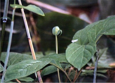 写真を見ておわかりだと思いますが、このヤマシャクヤクはつぼみです。ガクが1枚はがれたところで、多分、あともう何日かで開花する、という状態ではあります。なぜ開花した写真ではないかというと、この4日後には盗掘されてしまって、開花した花を撮ることができなかったのでした。 野幌森林公園の散策路沿いでは、葉が1〜2枚の若いヤマシャクヤクの株なら毎年何株か見ることができます。ところが、つぼみがつくようになって誰が見てもヤマシャクヤクとわかるようになると、開花前に必ず盗掘されてしまいまいます。そんなこんなで、私はヤマシャクヤクの開花株を、まだ見た事がありません。