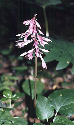 森林公園内だと、コケイランより少し遅れて咲き始めます。 花の穂を、戦国時代の大将が戦の時に指図に使った采配(さいはい)に見立てて采配蘭の名がつきました。 花は茎の一方側にやや片寄って下向きにつきます。写真は、珍しく正面から撮れました。残念ながら、まだ緑色のサイハイランにはお目にかかったことはありません。紫紅色のものも群生こそしていませんが、森林公園の散策路沿いでも丁寧に見て歩けば何本か見ることが出来ます。 ただ、公園内で赤っぽい花は珍しいせいか、目立つところに咲いた花はよく盗られてしまいます。初めて森林公園に行ったときに比べると、道ばたで見られるサイハイランは3分に1以下に減ってしまったように思われます。