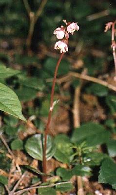 小葉一薬草(こばのいちやくそう)は、小さい葉のイチヤクソウという意味です。イチヤクソウという植物は、花を乾かして薬にすることから その名がついていますが、高さが20cm以上で葉も4〜7cmあります。コバノイチヤクソウはイチヤクソウに比べて葉が小さく(長さ2.5cmくらい)卵状の楕円形をしています。 太陽光線が苦手らしくて、散策路沿いではまず見られませんが、森林公園内では、7月の終わりから8月中旬くらいまで、林の中で沢山見られます。淡くピンクがかった白い花が群生している様子は、とても可愛らしいものです。
