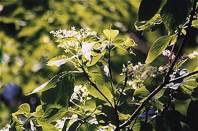 芽をふく時期に地中から多量の水を吸い上げ、枝を折ると樹液がしたたるのが水木(みずき)の名の由来だと言われています。6月中旬頃から白い四弁の小花が密集して咲く様子は、森林公園内でもよく見られます。9月も中旬になると球形の実がなって、赤色から黒色になって熟します。