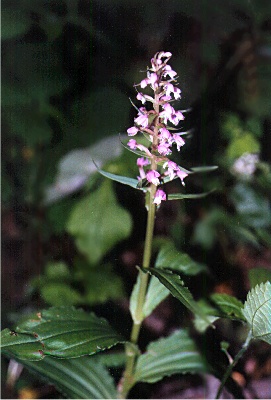 伸根千鳥(のびねちどり)は、根が横によく伸びる性質があるところからついた名です。幅広い葉が4〜7枚くらいで、ふちが波状になるのが特徴的です。1cmくらいの小さな花が穂状に沢山つきます。花の色は赤や白もあるようですが、野幌森林公園では、私はピンク色の花しか見たことはありません。 赤やピンクの花がつく植物は、すぐに盗掘される傾向があるのですが、ノビネチドリは花が小さいせいか多少は散策路沿いでも残っているようです。写真のノビネチドリは、いつも通る散策路わきの溝に一本だけ咲いていた物です。多分、道路わきの斜面の上の方に群生している所があって、そこから種などがこぼれて落ちて、一本だけ咲くことになったのでしょう。できれば、このまま盗られことなく、散策路わきで増えて欲しいと思いながら写真を撮りました。